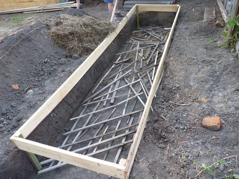 ТЕПЛЫЕ ГРЯДКИ МЫ ДЕЛАЕМ ТАК: Теплые грядки мы делаем в траншее. Для этого сначала выкапываем траншею глубиной 40 см, шириной 1м, длиной 5 м. По краю грядки делаем бордюры. На дно грядки укладываем ветки или ненужные палки, старые колышки для дренажа.