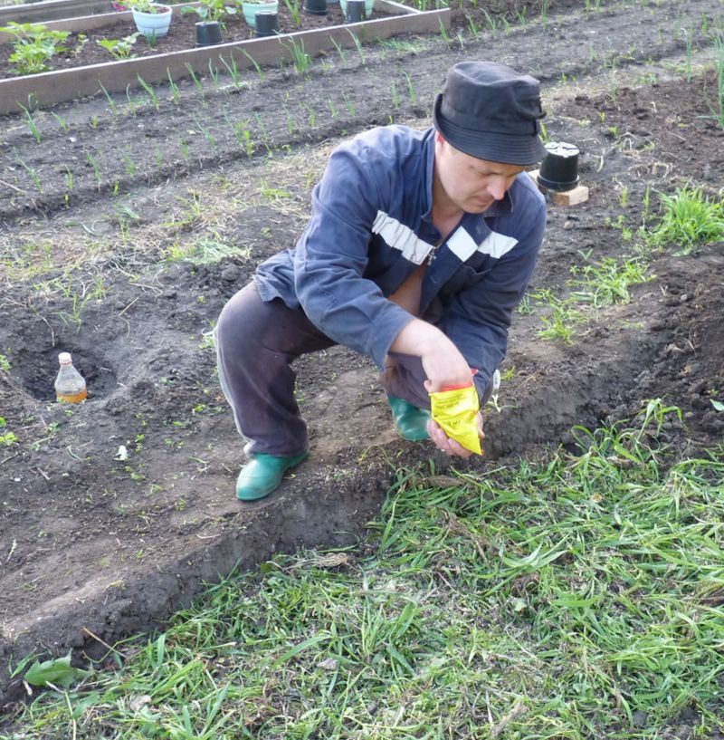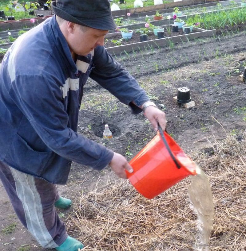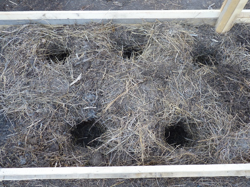 Как только грядка разогреется, в ней делаем лунки размером с ведро. Заполняем питательным грунтом и высаживаем в них растения. Сверху грядку присыпаем почвой, а потом мульчируем.
