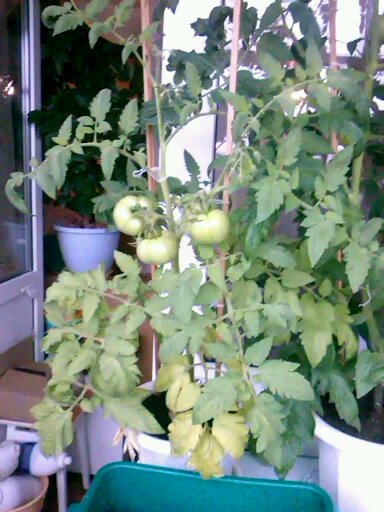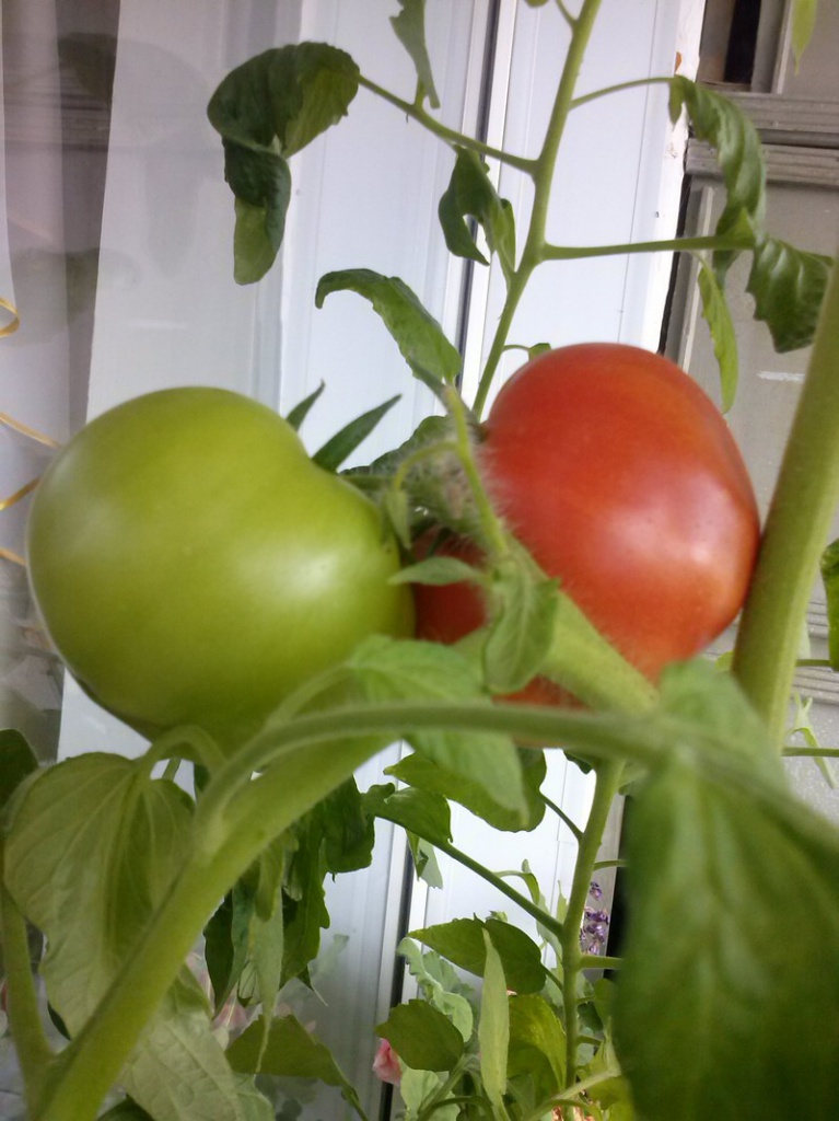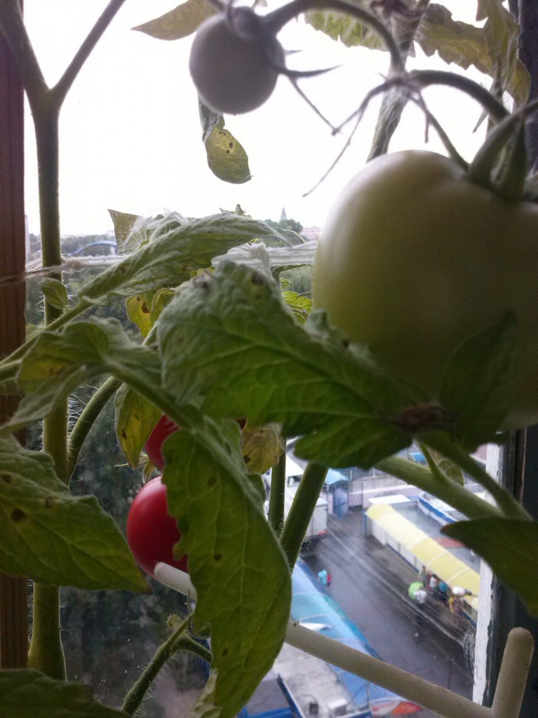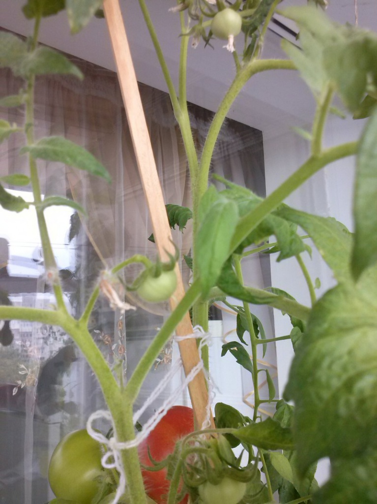 Помидоры на балконе появились немного позже. Из рассады взяла по одному кустику разных сортов (2 средних сорта и 4 ранних гибрида).