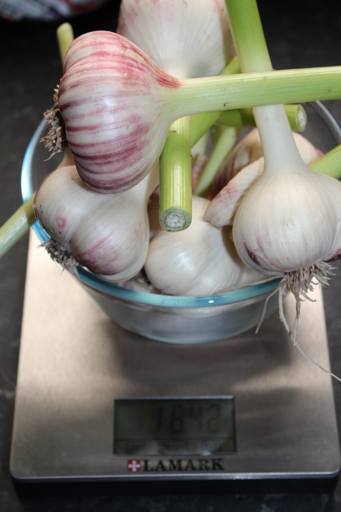 Урожай чеснока на половине гряды вытянул на 1 758г (12 головок).А урожай чеснока с правой половины гряды ( без осенней обработки) - 1642г (12 головок). Прибавка хоть и небольшая (примерно 10%), а всё равно приятно. А самое главное - урожай собрали, а земля за сезон только "богаче" " стала.