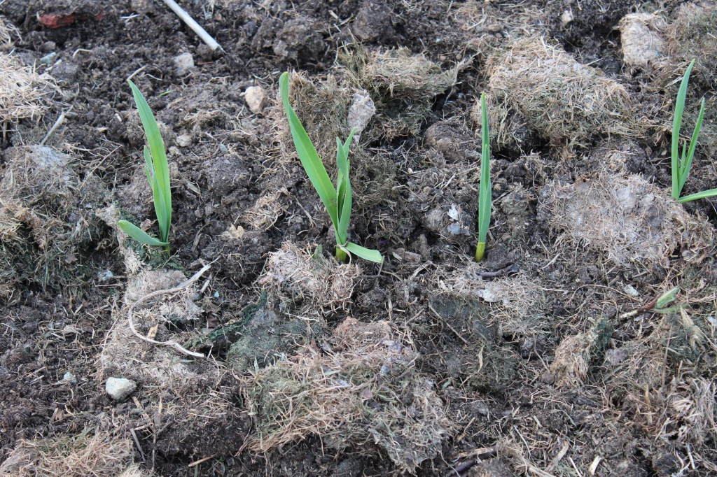 Гряду замульчировали толстым слоем газонного скоса. (20 см ) и со спокойной совестью оставили чеснок зимовать.Весной прорыхлили мульчу ( газонный скос мелкий и очень сильно уплотняется, образуя досаточно плотную корку, через которую пробиться росткам чеснока бывает сложно) и пролили Сияние -1 раствором 1:1000 ( Сияние -1 концентрат 1 столовая ложка на 10 л воды).