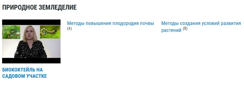 Видеошкола состоит из нескольких разделов. В первом разделе «природное земледелие» размещаются видеоуроки о методах повышения плодородия почвы и создания условий развития растений. Это те способы, которые улучшают развитие растений, повышают их урожайность и снижают время на обработку почвы и уход за растениями.