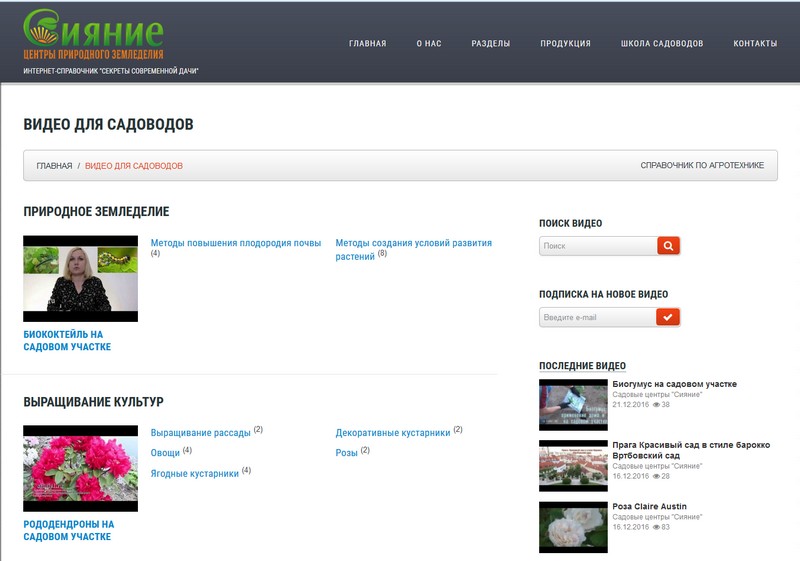 Она находится на сайте «Сияние. Природное земледелие. Сад, огород, дача» (sianie1.ru). В правой части страницы видеошколы есть окно поиска, благодаря которому вы сможете быстро найти видеоуроки по нужной вам тематике. Ниже в блоке «последние видео» показаны новые видеоуроки.