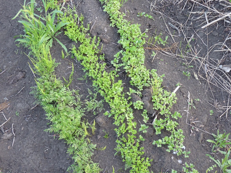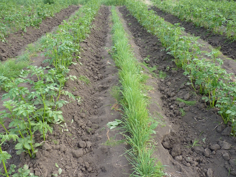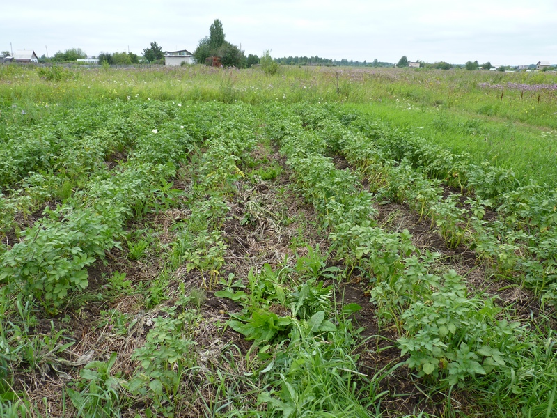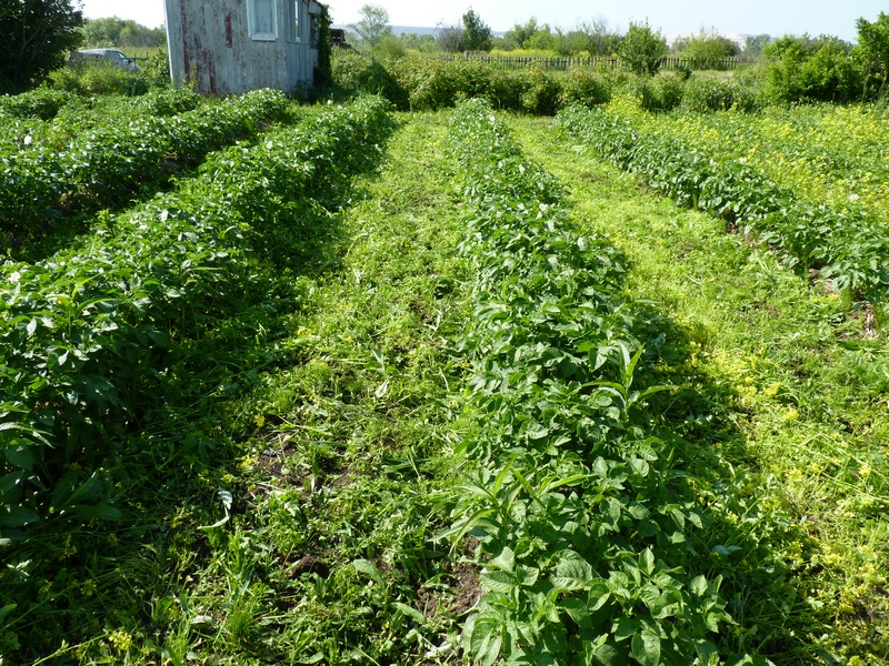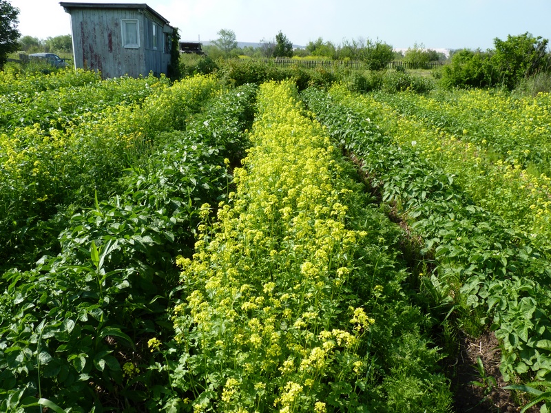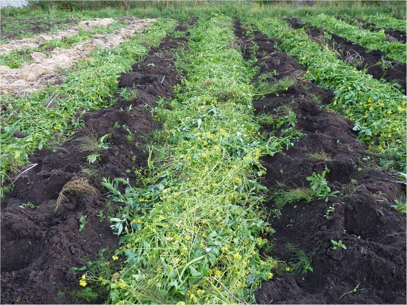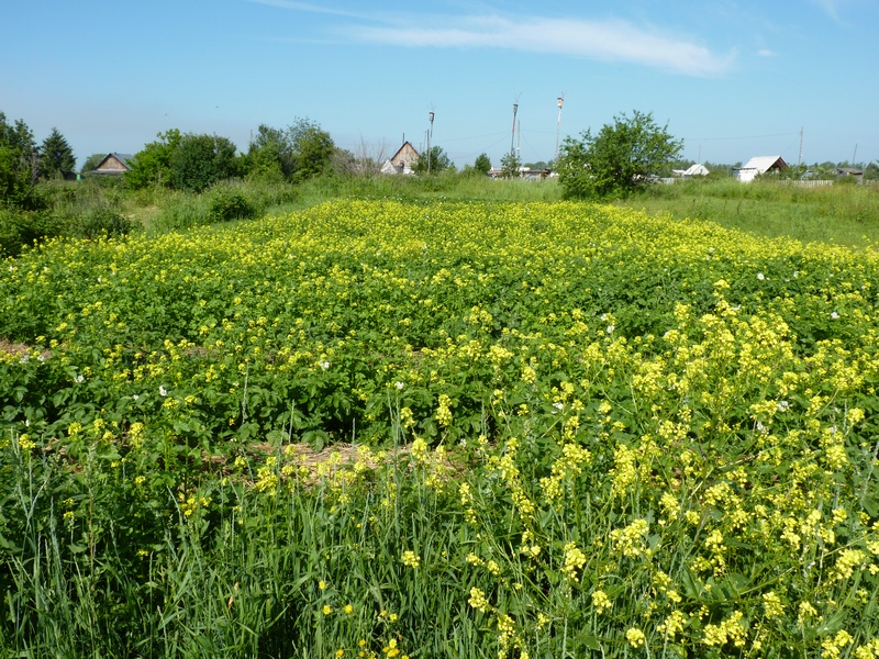 Пол-участка засеяли сидератами, а половину засадили картофелем. При этом картофельные ряды чередовали с рядами сидератов (рожь и горчица). Лето было жаркое, а земля бедная сидераты всходили долго и наращивали массу слабо.