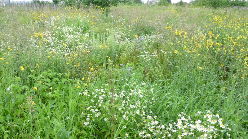 Нынче нас удивила еще одна картина. Часть участка, на котором в прошлые годы росли сидераты, в этом году осталось ничем не засажена. Вместо буйных сорняков она зацвела полевыми цветами, в то время когда соседский участок зарос одним пыреем.