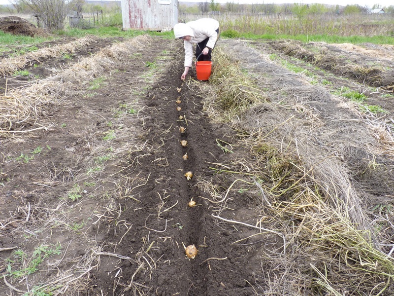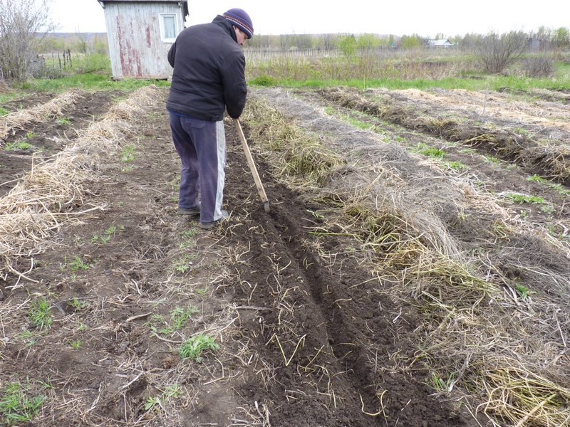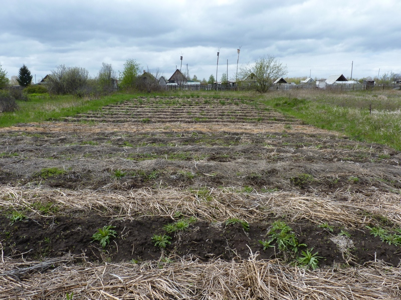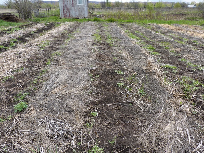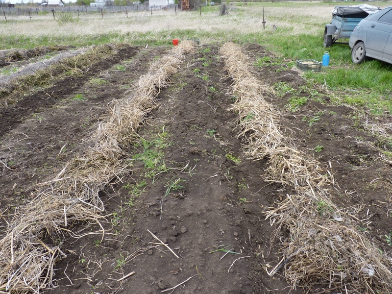 Картофельные ряды после посадки прикрыли органикой.