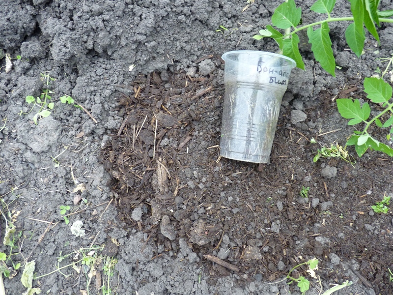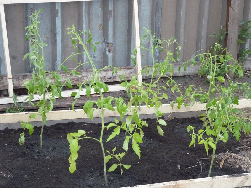 Уже через несколько дней мы сделали лунки, засыпали в них по 10л питательного грунта и высадили рассаду томатов.