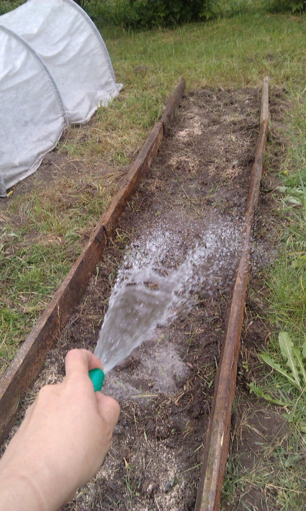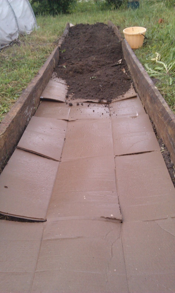 5. Поверх картона засыпаем слой земли сантиметров 7-10. Идеально, конечно, если она взята из компостной кучи. Но коли таковой не имеется пока на участке, пригодится любая очищенная от сорняков земля. В которую можно добавить золу, Сияние-2, биогумус и т.д. Пока не высадите культурные растения поливайте водой.
