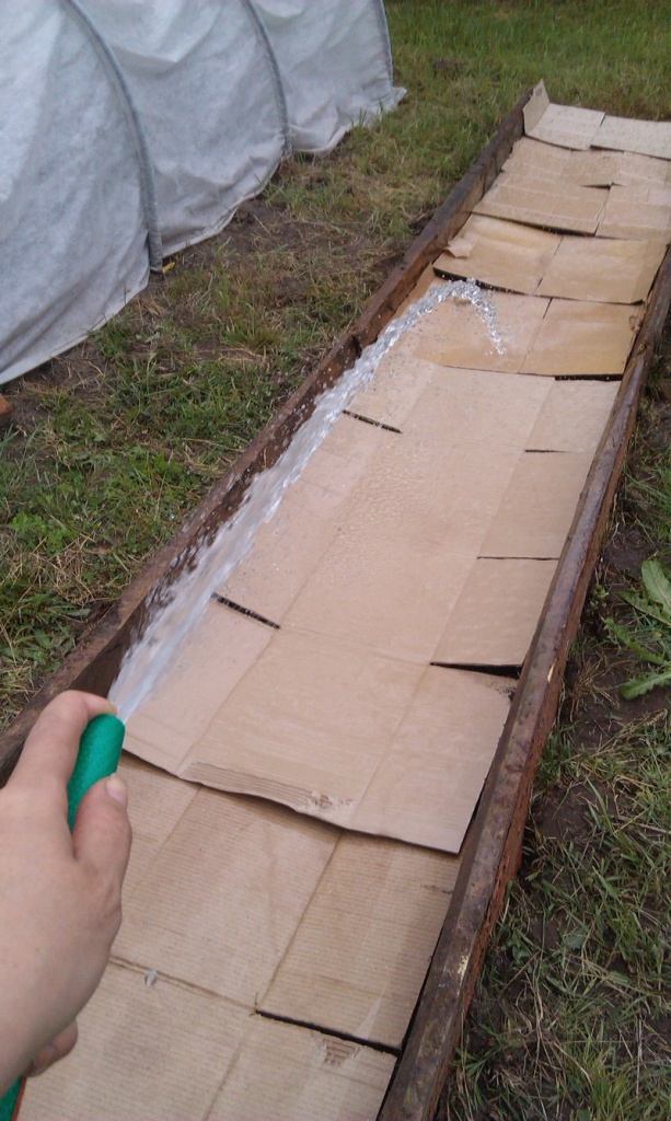 4. Укладываем куски картона, предварительно очистив его от скотча и других синтетических материалов. Хорош в этом деле старый мятый и мягкий. Если он очень плотный, то желательно сделать в нем несколько проколов ножом, чтобы он быстрее пропитался водой. Картон тоже поливаем водой так, чтобы он увлажнился.